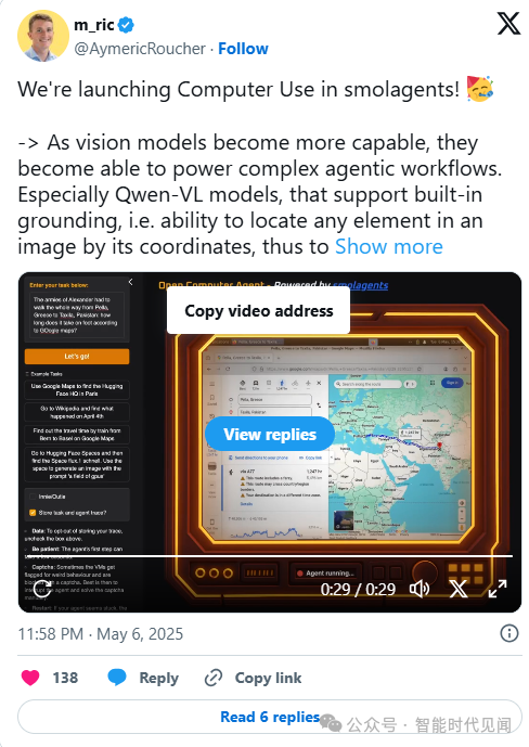 Hugging Face智能体团队的成员艾默里克・鲁彻(Aymeric Roucher)在X平台(原推特)上的一篇帖子中写道:“我们在smolagents中推出计算机操作功能啦!随着视觉模型的能力不断增强,它们已能够为复杂的智能体工作流程提供支持。其中一些模型,尤其是通义千问 - 视觉语言(Qwen - VL)模型,它支持内置的定位功能,也就是说,具备通过坐标在图像中定位任何元素的能力,因此能够点击虚拟机中的任何项目。”