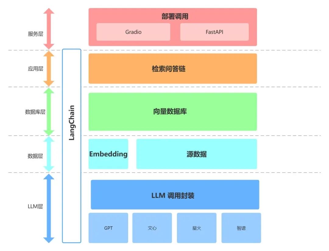 从底向上依次分为 LLM 层、数据层、数据库层、应用层与服务层: