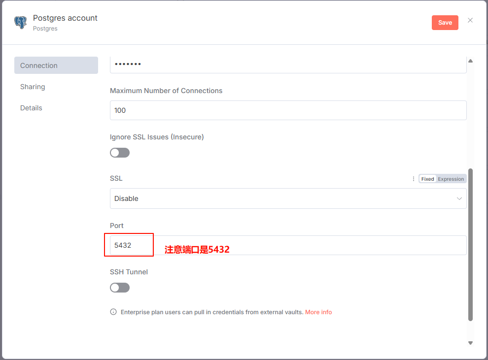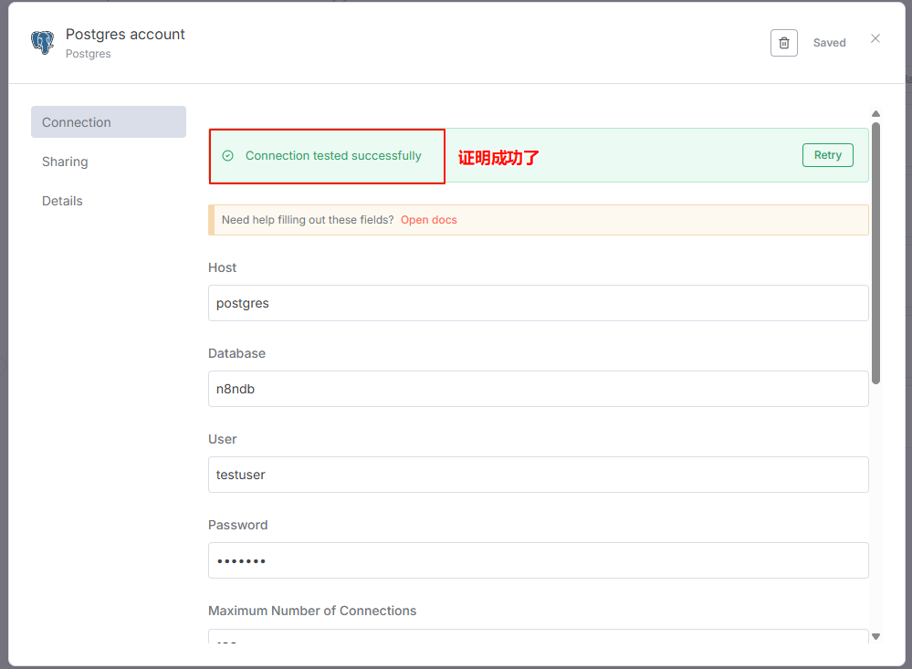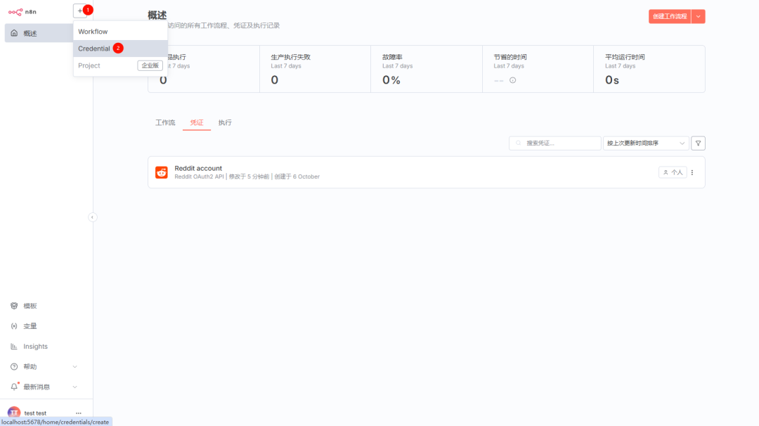 服务启动后,我们需要在 n8n 中设置凭证,以便工作流可以连接到数据库和 AI 模型服务。