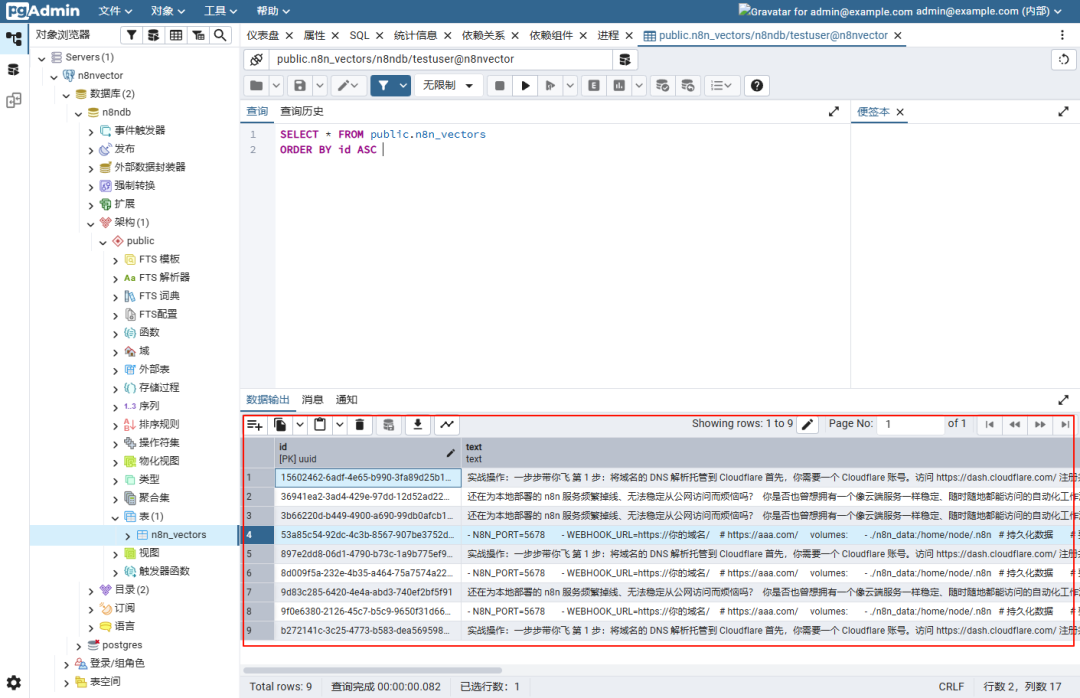 services: n8n: image:n8nio/n8n container_name:n8n restart:always ports: -"5678:5678"# 外部访问端口映射 environment: -GENERIC_TIMEZONE=Asia/Shanghai# 设置时区 -TZ=Asia/Shanghai # 设置时区 -N8N_DEFAULT_LOCALE=zh-CN # 设置语言 -N8N_HOST=你的域名 # aaa.com -N8N_PORT=5678 -WEBHOOK_URL=https://你的域名/ # https://aaa.com/ volumes: -./n8n_data:/home/node/.n8n # 持久化数据 # 要想中文生效,需配置下面这个语言包(路径使用自己的) #- D:\n8n-i18n-chinese-n8n-1.111.1\editor-ui-dist:/usr/local/lib/node_modules/n8n/node_modules/n8n-editor-ui/dist cloudflared: image:cloudflare/cloudflared:latest container_name:cloudflared restart:always command:tunnelrun environment: -TUNNEL_TOKEN=粘贴你刚刚从Cloudflare复制的TOKENpostgres: image:ankane/pgvector:latest container_name:pgvector restart:always environment: POSTGRES_DB:n8ndb POSTGRES_USER:testuser POSTGRES_PASSWORD:testpwd ports: -"5432:5432" volumes: -pgdata:/var/lib/postgresql/data# 持久化存储pgadmin:#数据库的可视化界面(非必需,可以查看数据库中的数据) image:dpage/pgadmin4:latest container_name:pgadmin restart:always environment: PGADMIN_DEFAULT_EMAIL:admin@example.com PGADMIN_DEFAULT_PASSWORD:admin1234 ports: -"8080:80" depends_on: -postgresvolumes:pgdata: name:pgdata # 显式命名,防止重复创建
