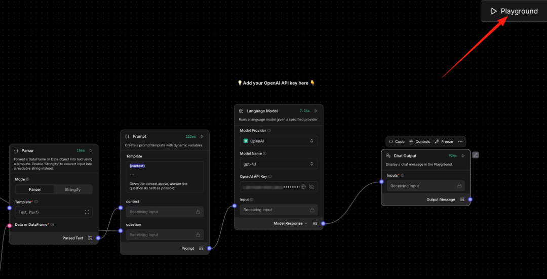 此外,LangFlow还有组件库与自定义能力:内置主流 LLM、向量库的适配器,也支持用 Python 写自定义节点。并提供逐步执行、Playground 快速试验,与 LangSmith、LangFuse 等平台集成,方便回放执行链路、追踪性能。