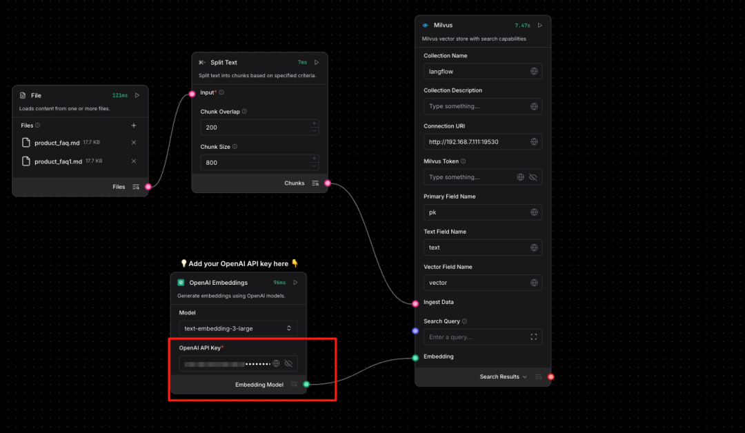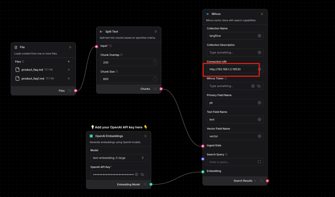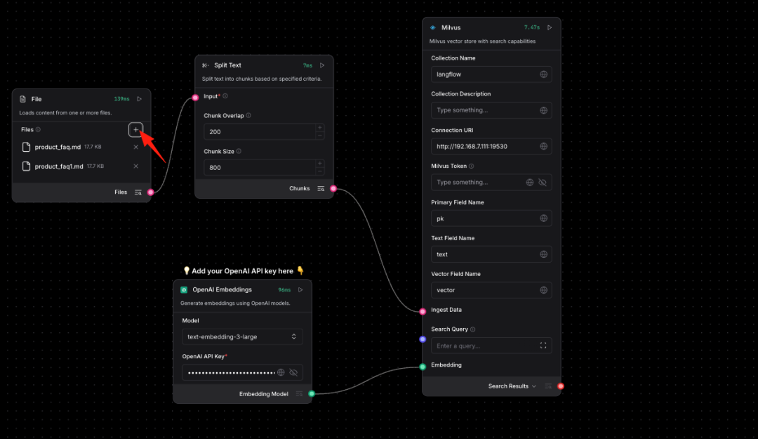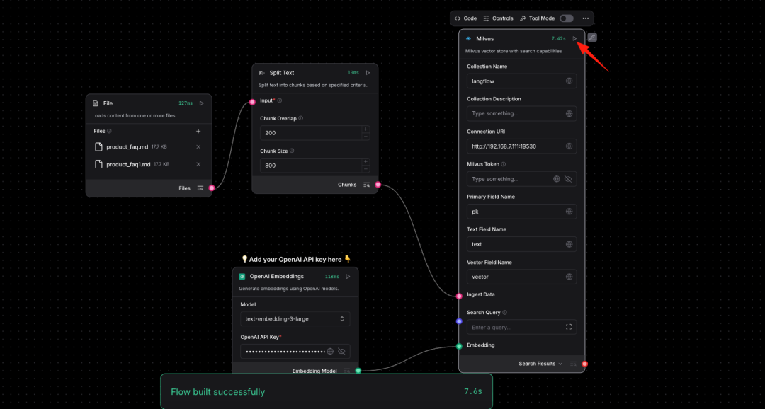 说明:必须上传2份以上的数据集才能正常嵌入Milvus,这是Langflow官方节点的Bug还未修复。