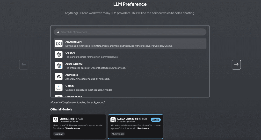 安装 AnythingLLM 后,启动应用程序并选择你的 LLM 提供商 - 你可以在 AnythingLLM 或 Ollama 之间进行选择(我建议在本教程中使用 AnythingLLM)。之后,选择一个模型(例如,我选择了 Phi-2)并点击保存更改。该软件将自动下载模型并为你设置一切。