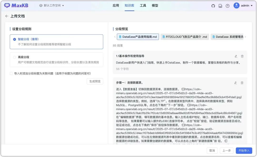 - • RAG智能问答:用户可以直接上传文档或自动抓取在线文档,MaxKB 会自动进行文本分割和向量化处理,有效减少大模型幻觉,提供精准的智能问答体验。