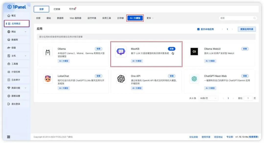 如果你使用1Panel面板,可以直接在应用商店中一键安装MaxKB,更加简单便捷。