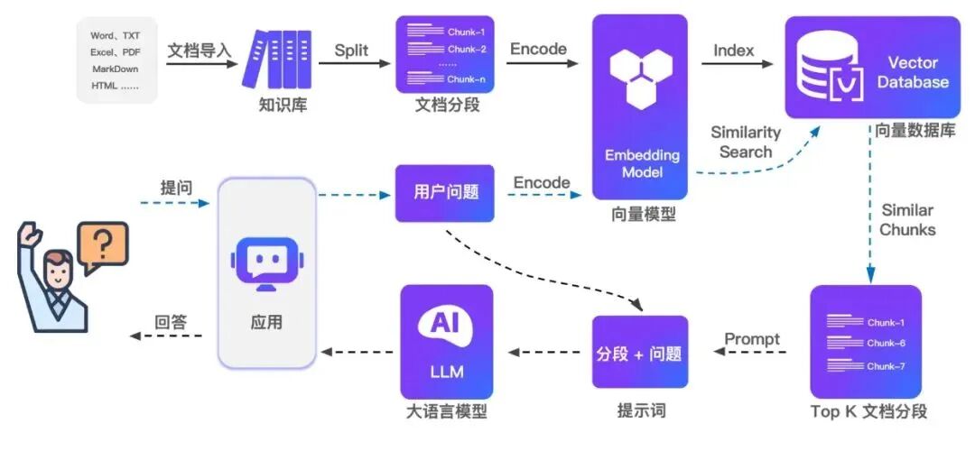 - • 文档处理:支持上传文档、自动爬取在线文档、自动文本分割、向量化