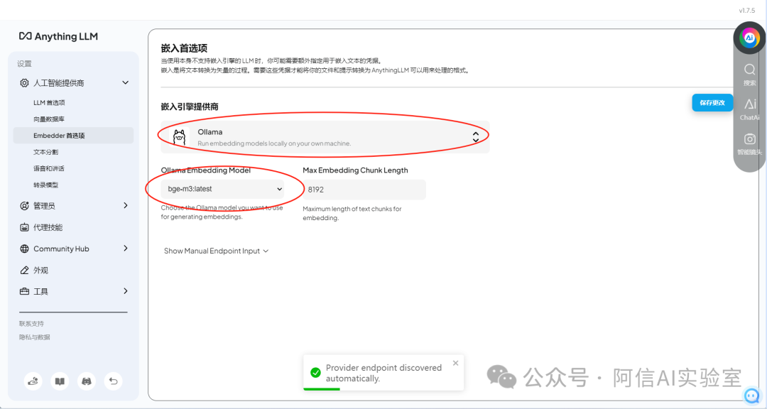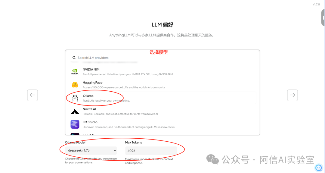 首次运行AnythingLLM,选择“Ollama”作为模型提供商。
