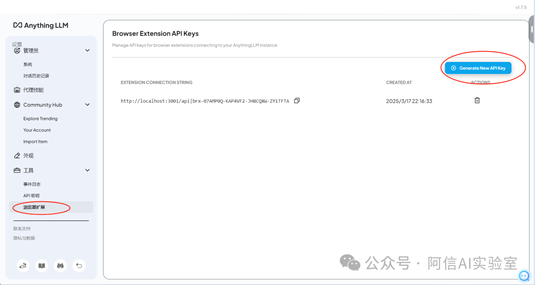 **浏览器扩展:**创建浏览器扩展API Keys,在浏览器中安装AnythingLLM插件,可以实现将网页的选择的文字或者整个页面信息同步到本地。