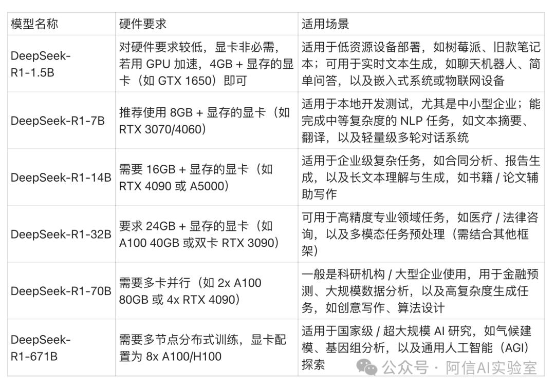 至于选择DeepSeek的哪个模型,需要看设备的配置如何。我这里部署的是7b模型,我的4070s显卡内存是12g;再往上14b需要4090了,一块显卡要几万块。不同模型对于设备的要求和使用场景如下: