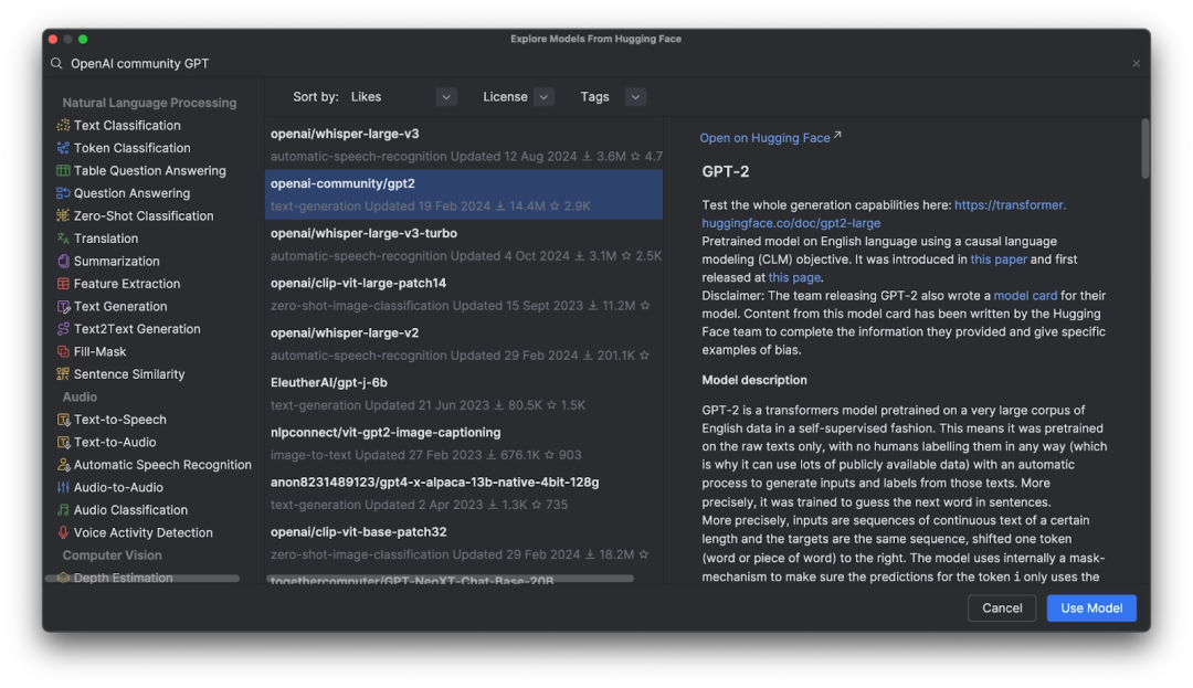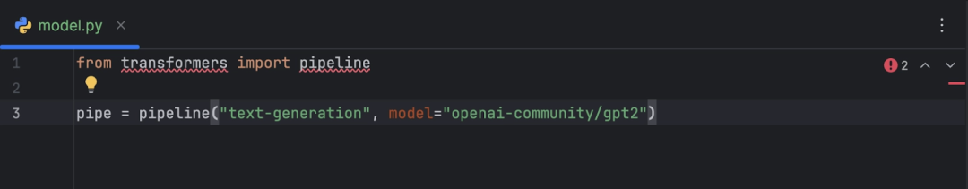 选择 OpenAI GPT-2 模型并将其添加到代码中后,我们会得到如下内容: