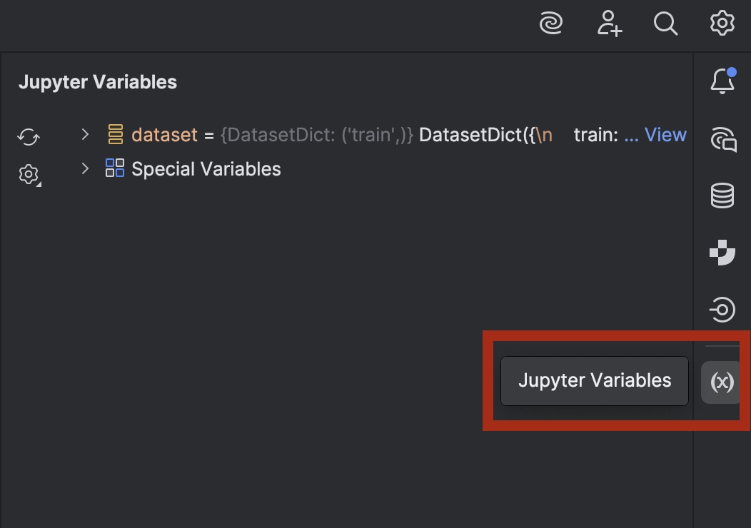 如果您好奇并想快速查看一下数据,可以在 PyCharm 中操作。 点击右侧的按钮,打开 Jupyter Variables(Jupyter 变量)窗口: