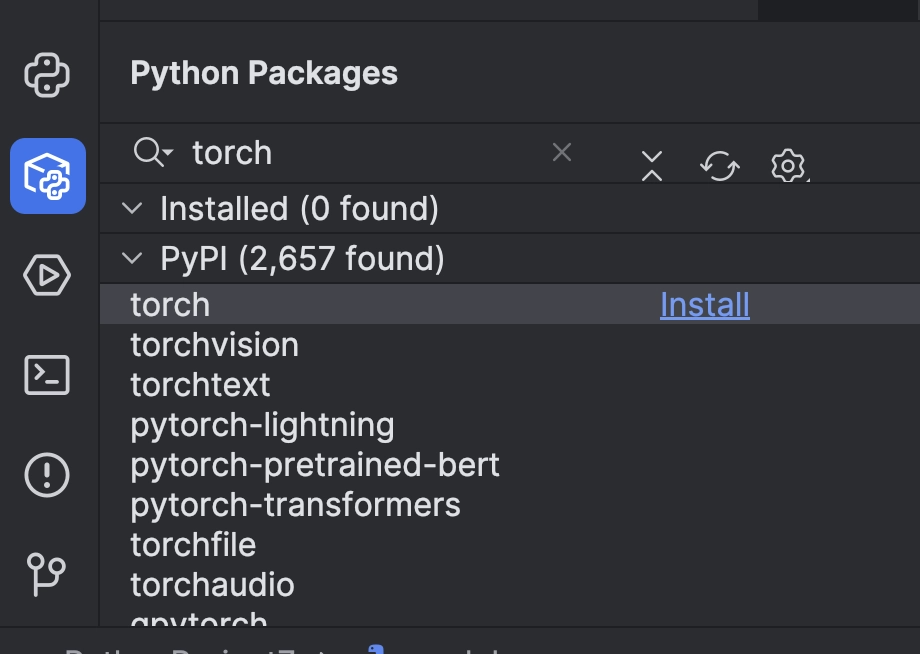 使用前,我们需要做一些准备工作。 首先,我们需要安装一个机器学习框架。 在本例中,我们选择了PyTorch。 您可以通过 PyCharm 中的 Python Packages(Python 软件包)窗口轻松完成安装。