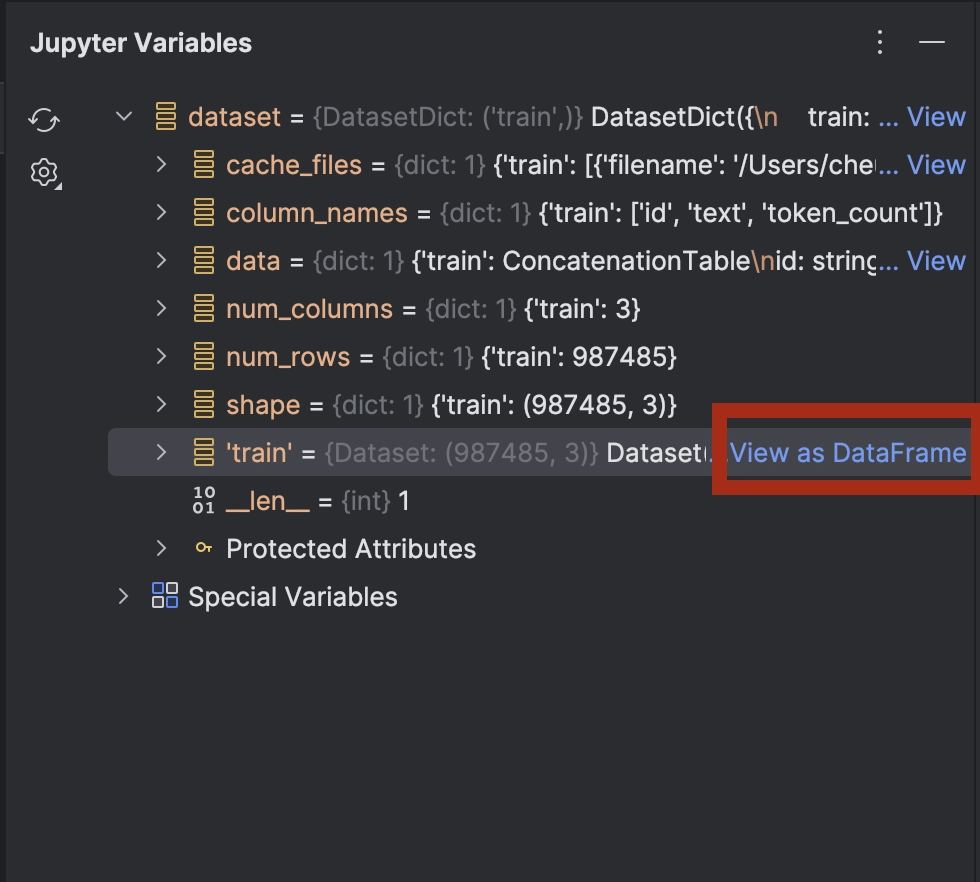 展开dataset,您会在dataset[‘train’]旁边看到View as DataFrame作为 DataFrame 查看)选项。