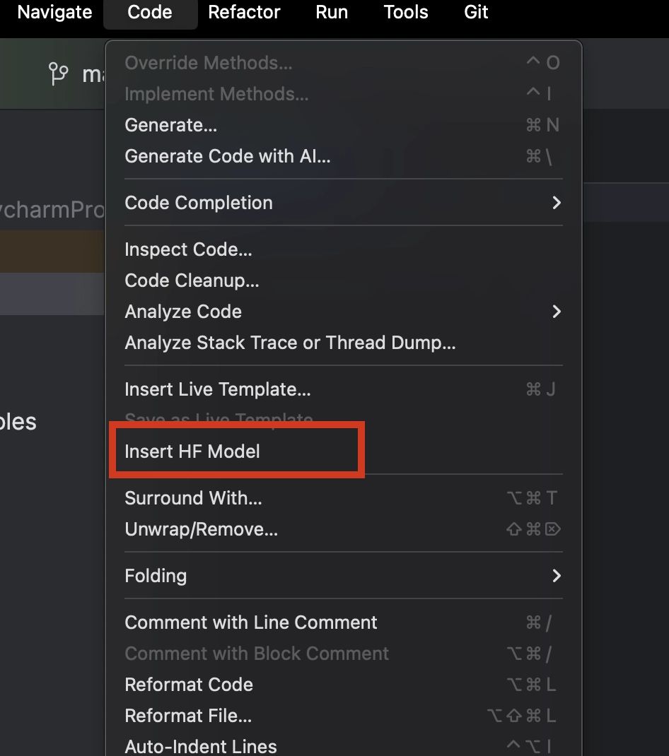 使用 PyCharm 时,我们可以轻松浏览并添加来自 Hugging Face 的任何模型。 在新建的 Python 文件中,从顶部的Code(代码)菜单中选择Insert HF Model(插入 HF 模型)。