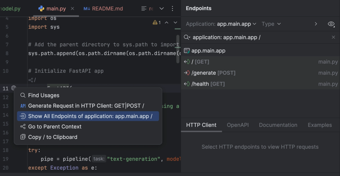我们还可以通过 Endpoints(端点)工具窗口检查所有端点。 点击第 11 行中的 app = FastAPI 旁边的地球图标,然后选择 Show All Endpoints(显示所有端点)。