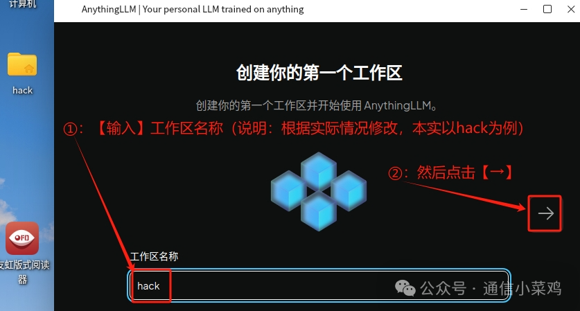 5.【输入】工作区名称,然后点击【→】(说明:根据实际情况修改,本实以hack为例)
