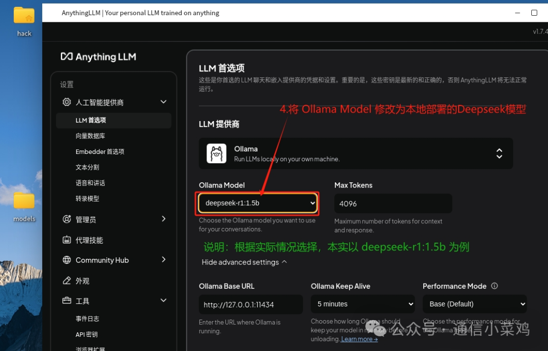 4.将 Ollama Model 修改为本地部署的Deepseek模型(说明:根据实际情况修改,本实以 deepseek-r1:1.5b 为例)