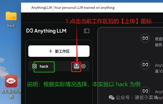 1.点击当前工作区后的【上传】图标(说明:根据实际情况选择,本实验以 hack 为例)