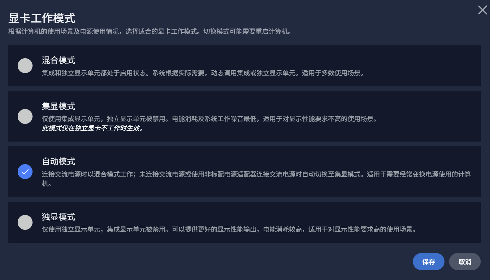 打开该软件后在左侧栏选择第二个游戏手柄的图标,打开后在右侧可以看到“显卡工作模式”的选项。点击后会有四种选项,混合模式、集显模式、自动模式、独显模式。推荐选择“自动模式”,该模式下只有在连接大板砖电源的时候才会开启独立显卡使用混合模式,其他时候都会自动关闭独立显卡,只使用集成显卡(包括离电和使用140W氮化镓时)。