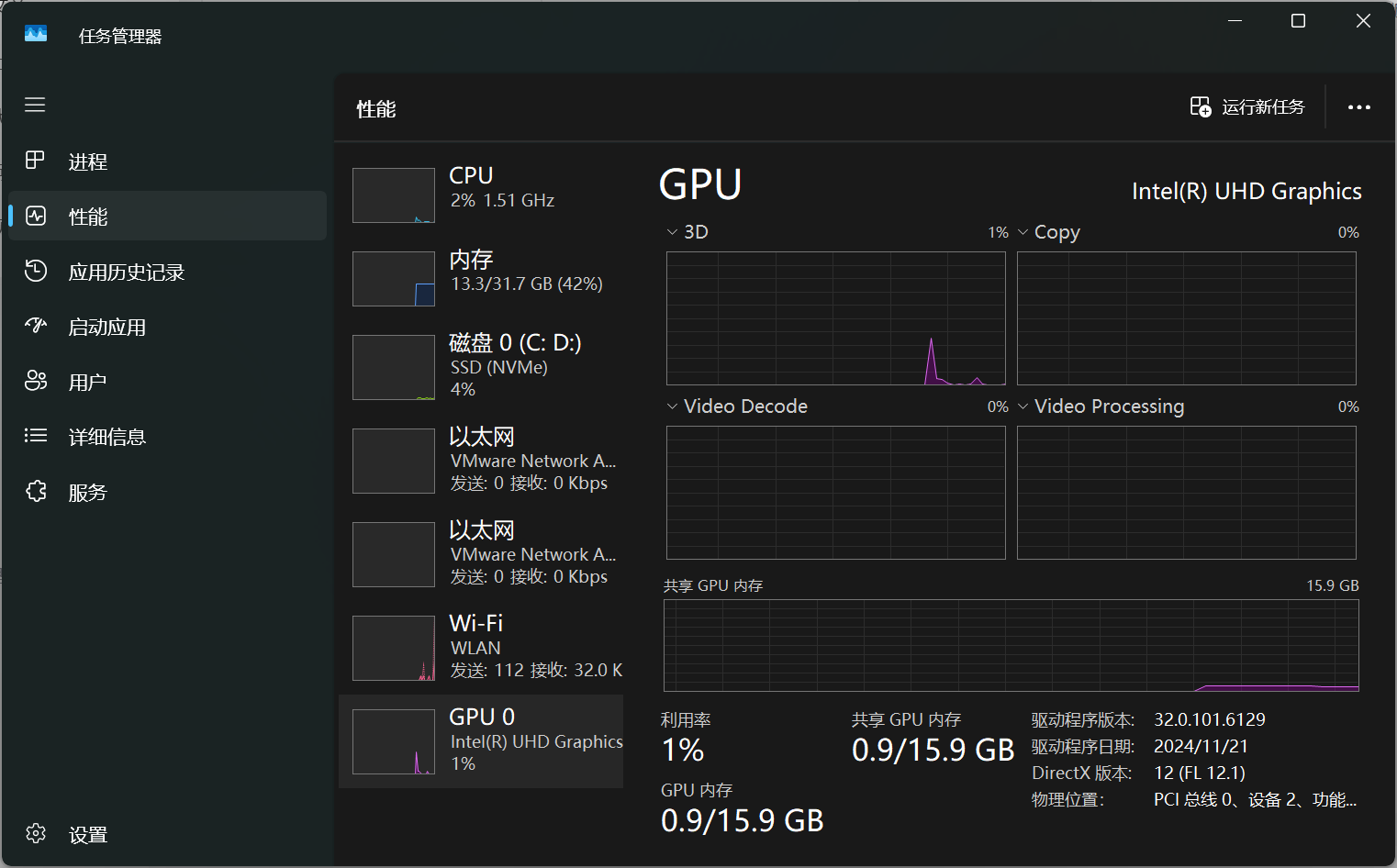 点击保存后,等待片刻,屏幕会闪一下,就切换到集成显卡模式了。可以使用任务管理器查看显卡工作情况:Ctrl+Alt+Delete。可以看到此时只有GPU0集成显卡,而没有了GPU1的独立显卡,说明操作成功!