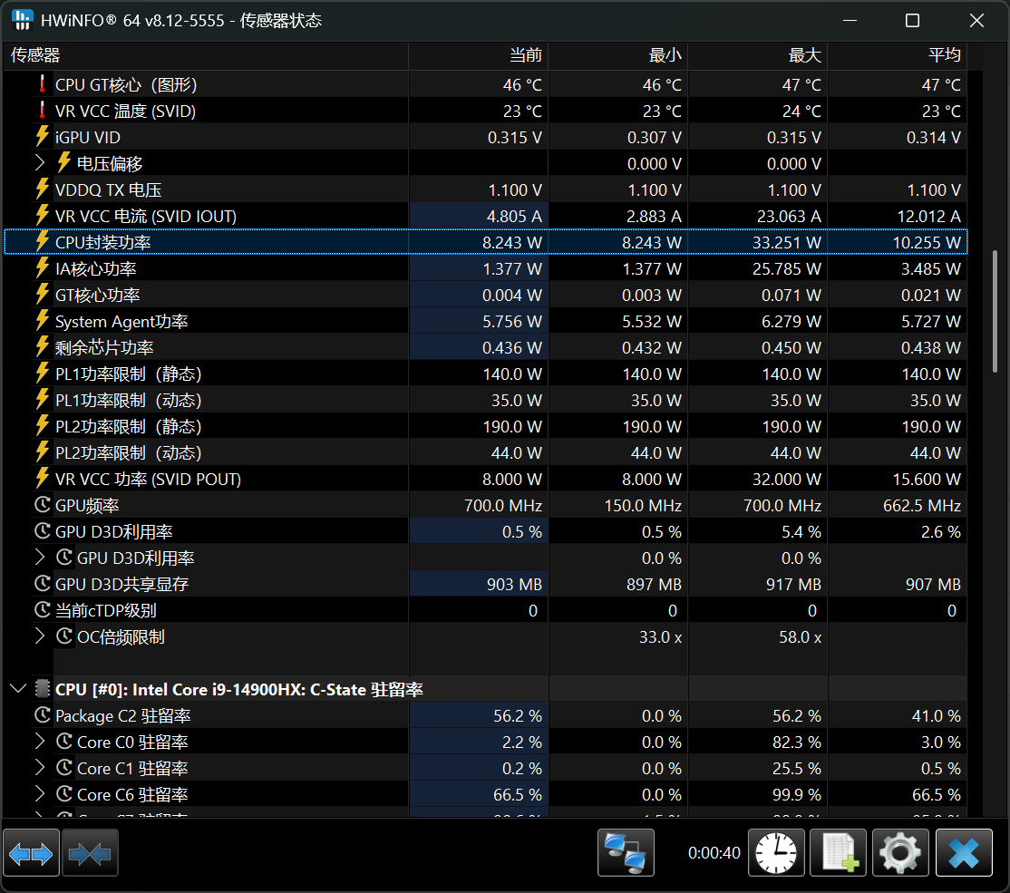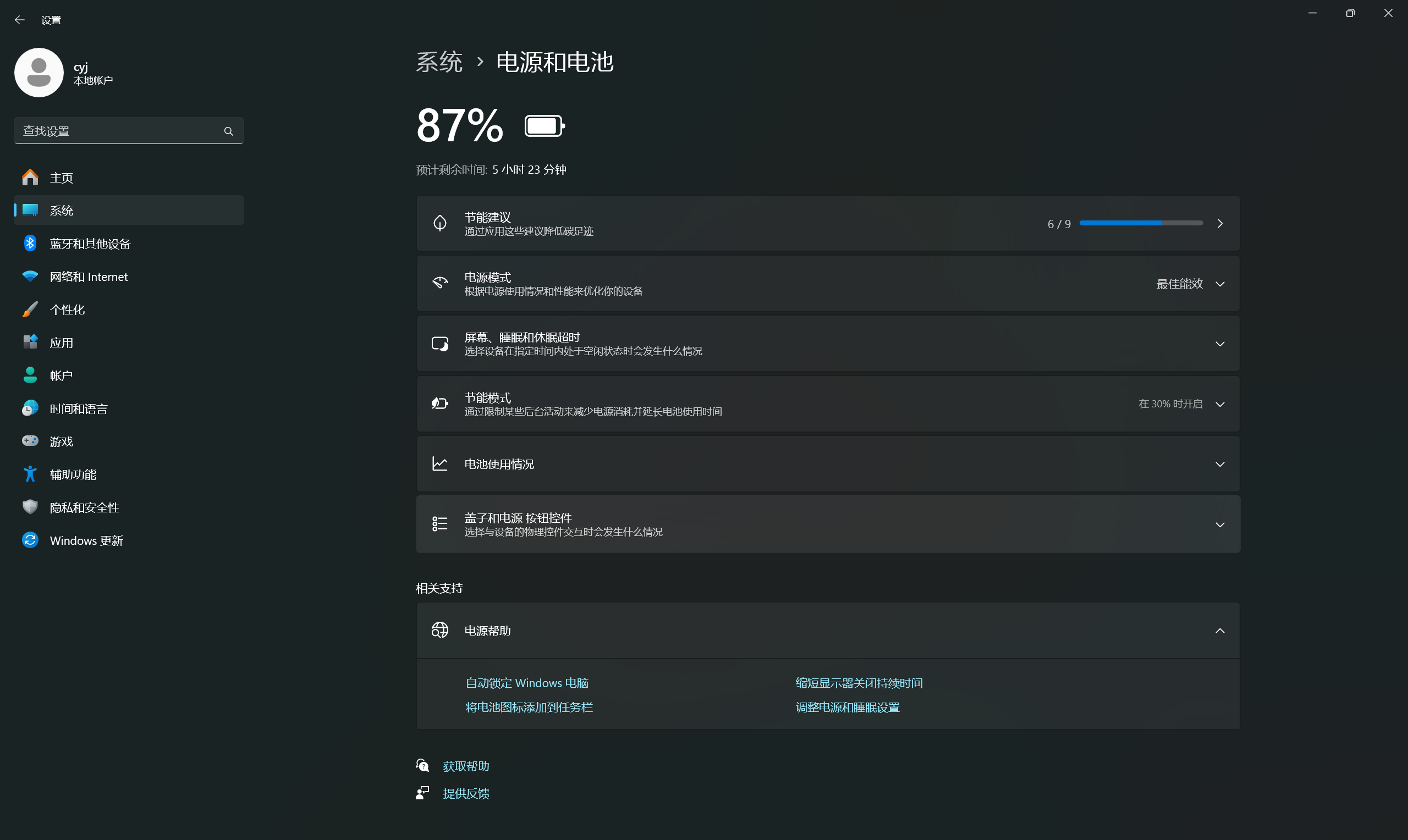 经过这一系列操作,CPU功率控制在了10W-20W之内,保证了长续航。可以看到87%电量下预估有5小时23分续航。这里可能有虚高,但是正常4小时续航肯定是没问题的。