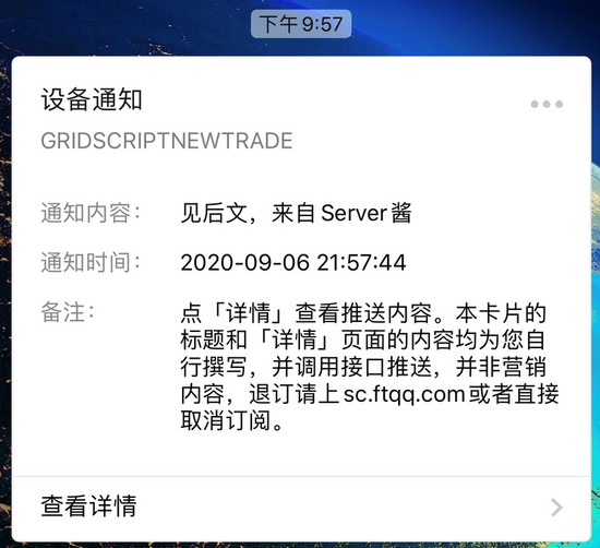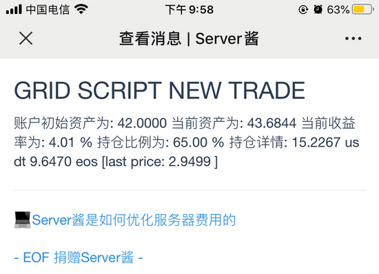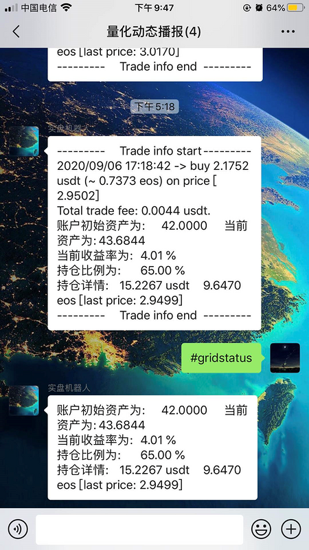 当前价格触发网格策略进行交易时,只需要在交易后总结当次交易的信息,然后利用类似上面的方法发送出来即可。实际操作中,我会把相应消息发送到我专门建的“量化动态播报”群里(目前在运行的有两个网格):