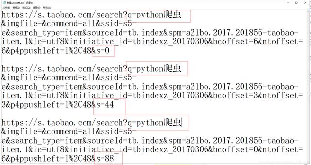 6.翻页方法,对比1,2,3页网址,发现只有q和s的属性有用,q是搜索,s是商品数,只需要填写这2个属性,用修改s的属性的方式翻页