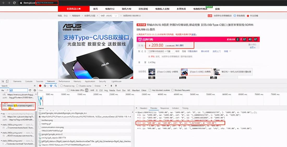 从商品详情的页面中打开 F12 控制面板,找到包含 p.3 的链接,在旁边的 preview 面板中可以看到当前商品价格