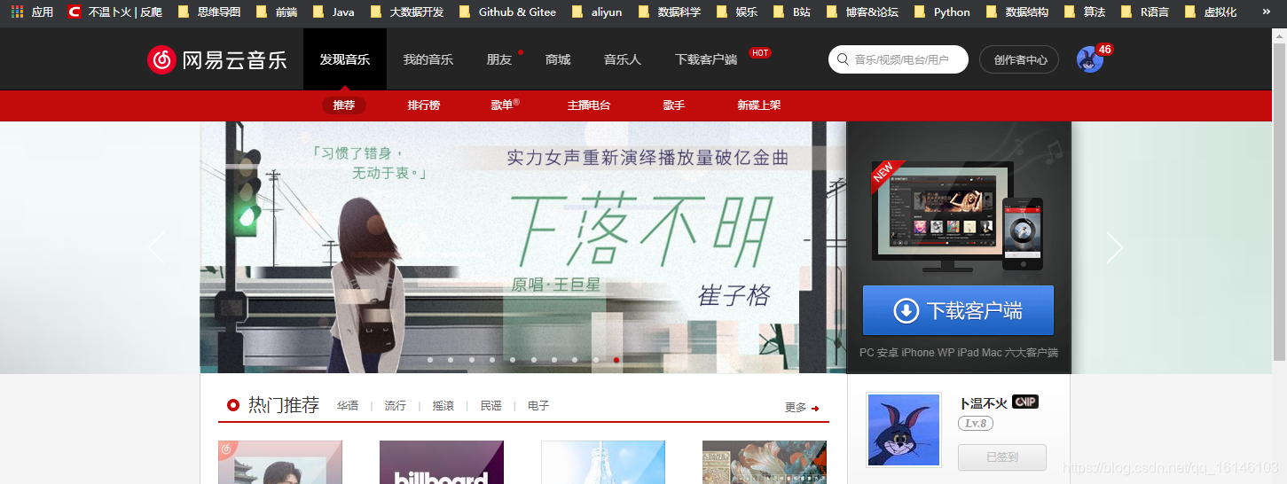 在此,博主爬取的是网易云网页版,因为一般网页版都是最好爬取的,不要问我为什么,问就是不会!