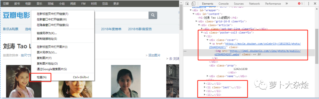 可以清晰的看到,每张图片都是保存在 li 标签中的,图片的地址保存在 li 标签中的 img 中。