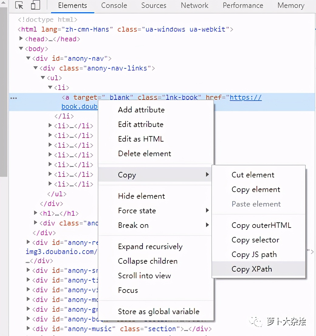 当然,XPath 非常强大,但是语法也相对复杂,不过我们可以通过 Chrome 的开发者工具来快速定位到元素的 xpath,如下图