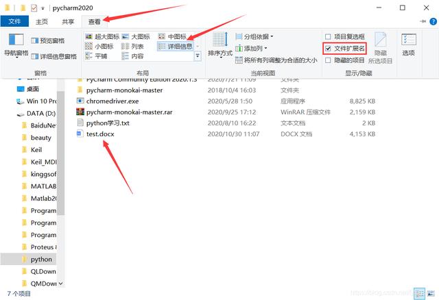 点击查看,选择详细信息,勾上文件扩展名。