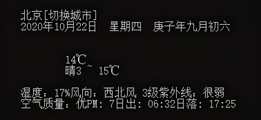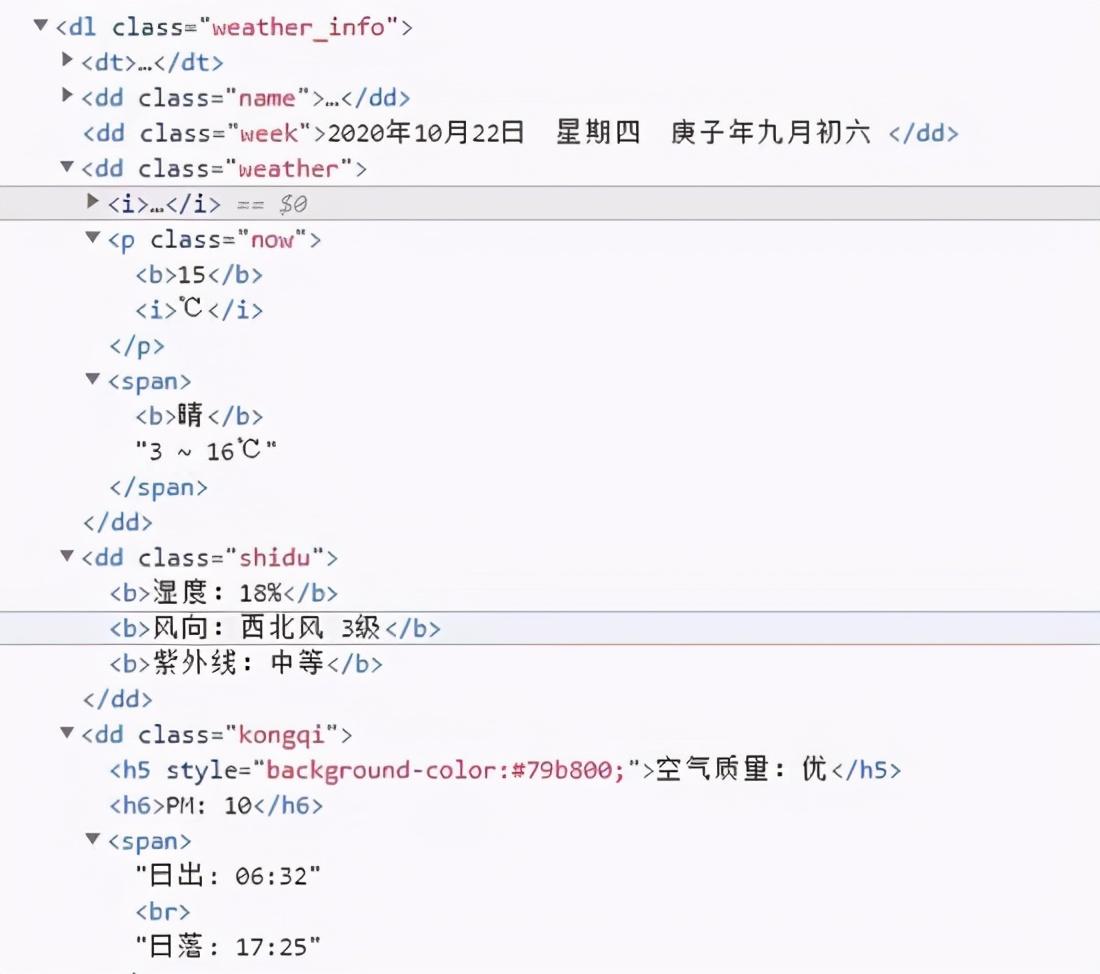 我们从网页请求获得的数据繁杂,其中只有一部分是我们真正想得到的数据,例如我们从天气的网站中查看北京的天气,只有下图中使我们想要得到的,我们如如何提取呢?这就要用到lxml.etree。