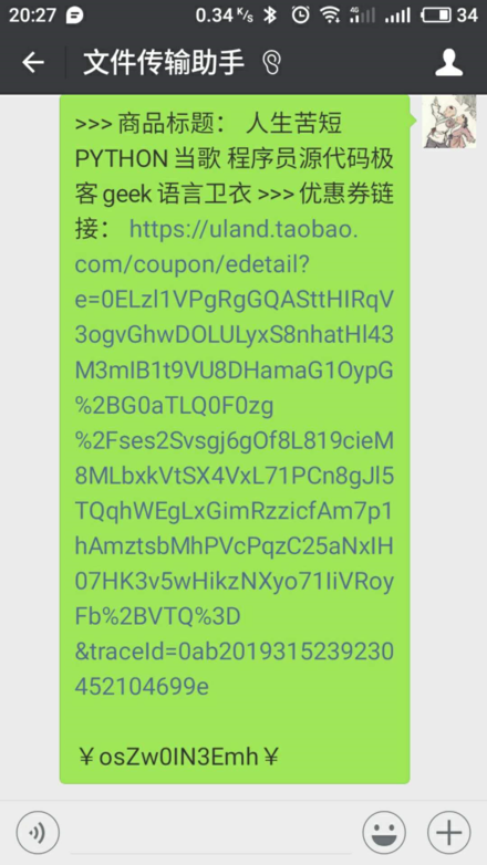返回的结果中,每一个以人民币符号起始和结束的就是淘口令,我们将其发送到手机上,再通过手机复制淘口令,看看淘口令的效果: