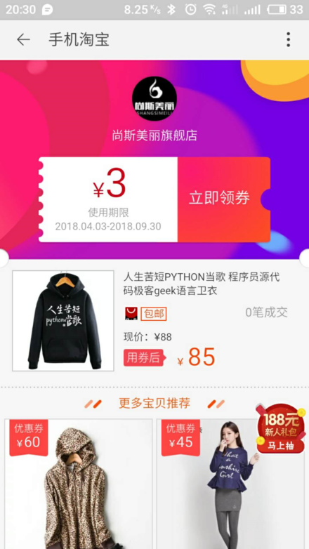 {'seller_id': 3126607078, 'nick': '尚斯美丽旗舰店', 'title': '人生苦短PYTHON当歌 程序员源代码极客geek语言卫衣', 'item_url': 'http://detail.tmall.com/item.htm?id=557367483076', 'num_iid': 557367483076, 'coupon_click_url': 'https://uland.taobao.com/coupon/edetail?e=Al70aB%2Bs3ogGQASttHIRqV3ogvGhwDOLULyxS8nhatHl43M3mIB1t9VU8DHamaG1OypG%2BG0aTLQ0F0zg%2Fses2Svsgj6gOf8L819cieM8MLbxkVtSX4VxL71PCn8gJl5TQqhWEgLxGimRzzicfAm7p1hAmztsbMhPVcPqzC25aNxIH07HK3v5wHikzNXyo71Icu6djhR%2BLpQ%3D&traceId=0bba60d215239195072098617e', 'coupon_remain_count': 9711, 'category': 16, 'commission_rate': '5.50', 'shop_title': '尚斯美丽旗舰店', 'coupon_info': '满5元减3元', 'user_type': 1, 'pict_url': 'http://img.alicdn.com/tfscom/i4/3126607078/TB1eY9vSVXXXXcoaXXXXXXXXXXX_!!0-item_pic.jpg', 'item_description': '', 'coupon_end_time': '2018-09-30', 'coupon_start_time': '2018-04-03', 'small_images': {'string': ['http://img.alicdn.com/tfscom/i2/3126607078/TB2GoPNXPTlJKJjSszbXXXS1FXa_!!3126607078.jpg', 'http://img.alicdn.com/tfscom/i1/3126607078/TB2k0IgaCGFJuJjSZFuXXcAyFXa_!!3126607078.jpg', 'http://img.alicdn.com/tfscom/i3/3126607078/TB2vUvNXPvmJKJjy0FlXXXGdFXa_!!3126607078.jpg', 'http://img.alicdn.com/tfscom/i3/3126607078/TB24VnQXPLlJKJjSsppXXXqgFXa_!!3126607078.jpg']}, 'coupon_total_count': 10000, 'zk_final_price': '88.00', 'volume': 0}