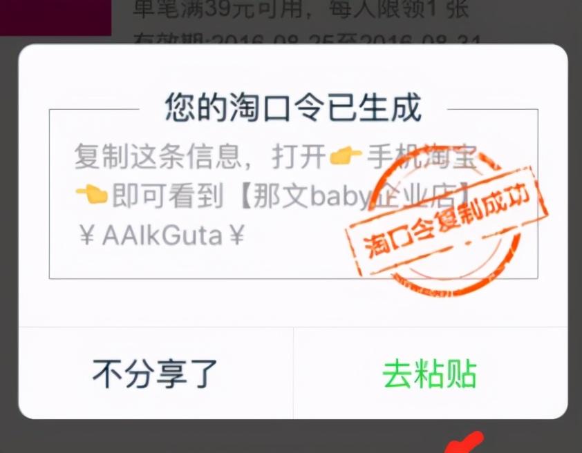 淘口令是淘宝的一种推广方式,专门针对于无线端的商品推广。淘口令在手机上复制之后,打开淘宝软件,就会自动跳转到淘口令的目标链接。所以淘口令相当于淘宝软件的一个暗号,既避免了其他平台对淘宝客链接的封杀,也方便推广和传播。一般淘宝联盟自动生成的淘口令推广信息如下图: