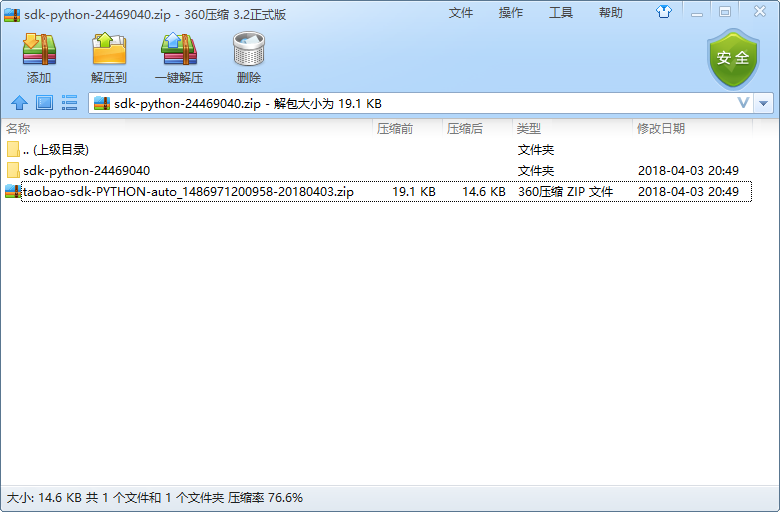 下载完成的 SDK 是一个名为 “sdk-python-*” 的压缩包,其中还有一个压缩包和一个空的文件夹: