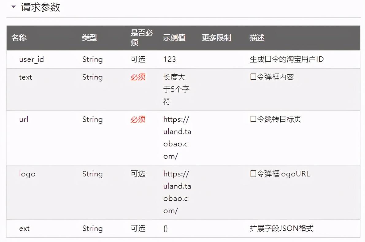 淘宝客淘口令 API,用于将淘宝客推广链接转换为淘口令,以实现复制优惠券信息后,打开淘宝就能跳转到推广链接的效果。其接受的参数如下: