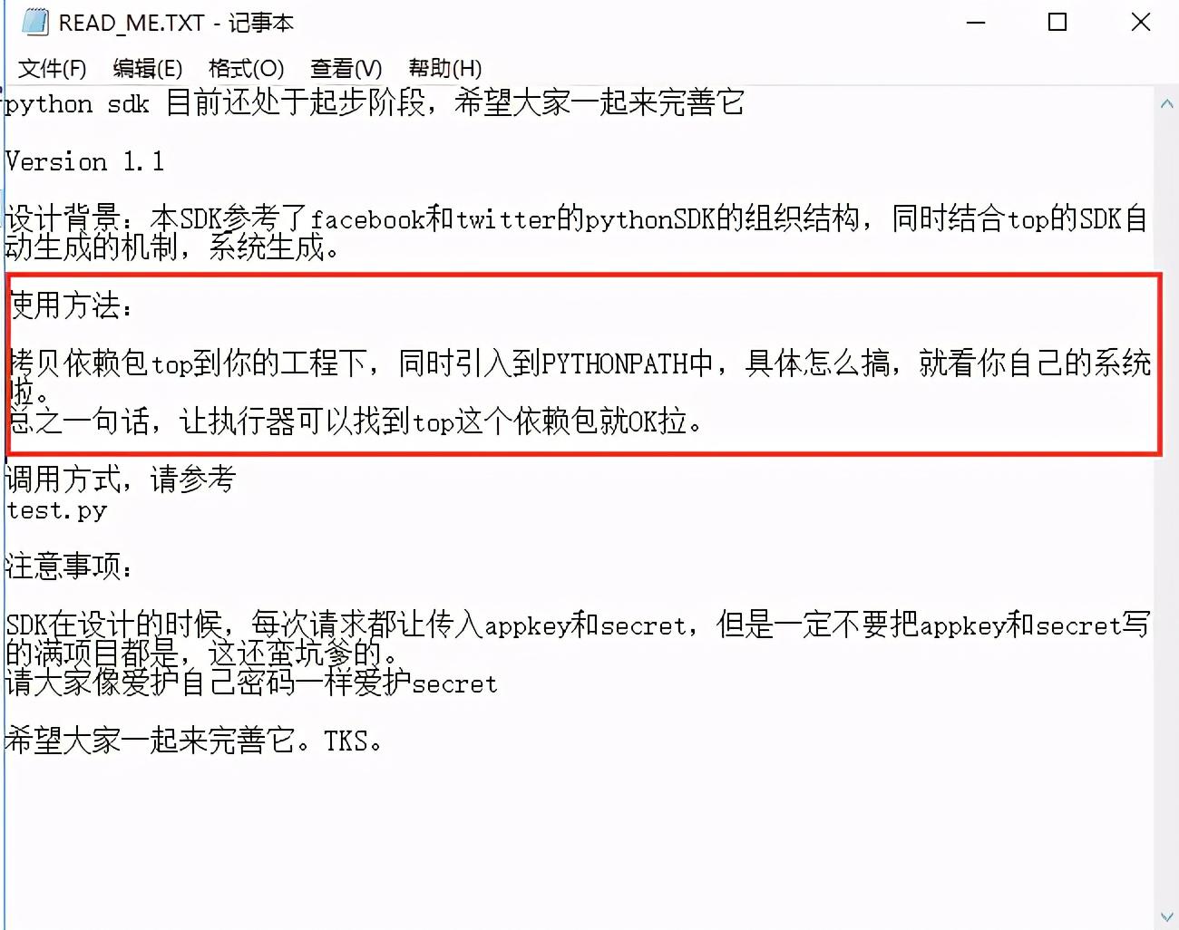面对一个陌生的包,好的习惯当然是查看 readme 之类的文件来知晓使用方法,我们打开 READ_ME.TXT 文件,里面的内容不多,但说明了 top 模块如何使用:复制 top 文件夹到自己的 Python 项目路径下,让 Python 执行器能够引入这个 top 包即可。