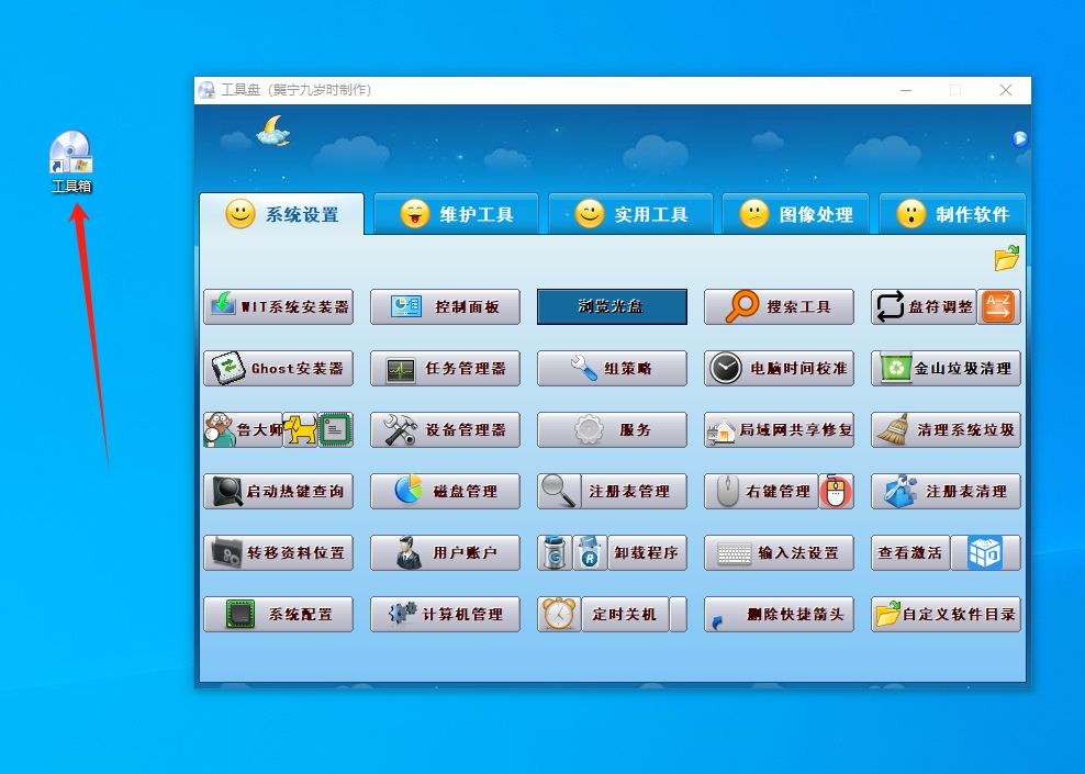 解压完成后,桌面会自动生成一个工具箱图标,点开即可启动工具箱,工具箱虽然有四类工具,但严格来说也可以分为两类:系统内置工具和优质第三方工具。