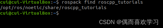 环境变量设置成功后再来查看roscpp_tutorials功能包的位置。现在,ROS查找到roscpp_tutorials功能包就在我们创建的catkin_ws工作空间下,这是因为在ROS_PACKAGE_PATH环境变量中,catkin_ws工作空间的路径在系统工作空间路径之前。