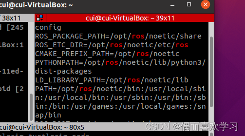 可以通过env | grep ros命令查看所有ROS相关的环境变量,其中包含我们最为关心的ROS_PACKAGE_PATH。如下图所示: