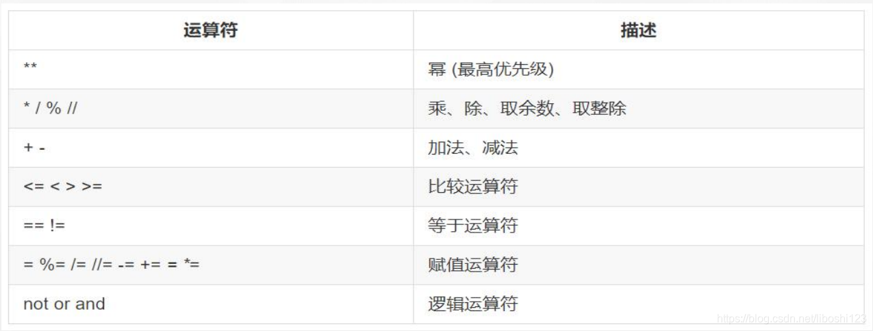 一般常用的运算符优先级如下:(从上到下按从高到低顺序显示)