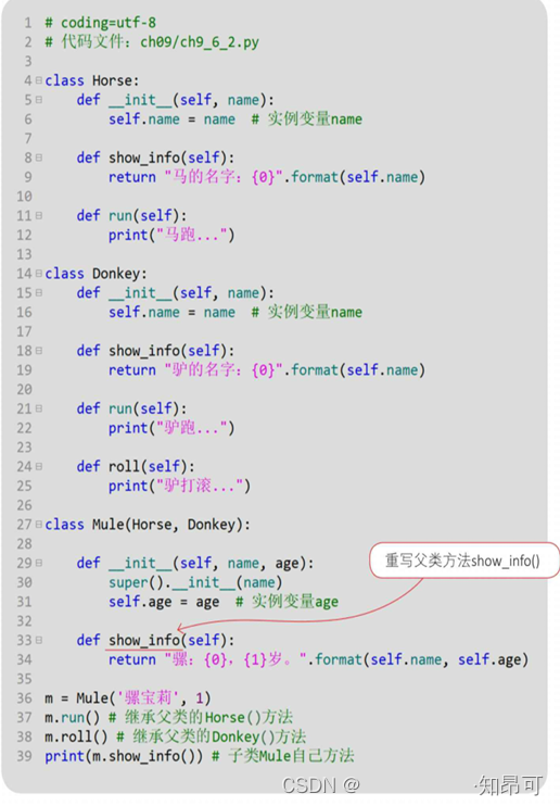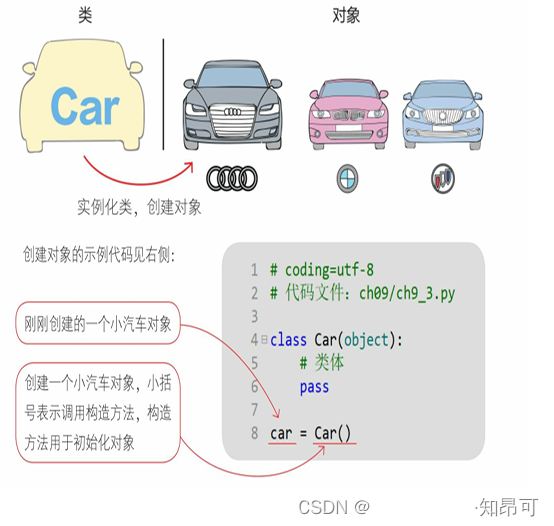 小汽车(Car)类继承了object类,object类是所有类的根类,在Pyth on中任何一个类(除object外)都直接或间接地继承了object,直接继承 object时(object)部分的代码可以省略。