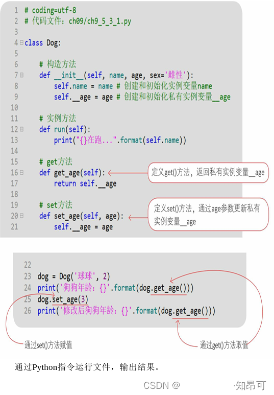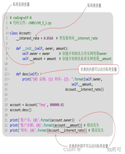 在默认情况下,Python中的变量是公有的,可以在类的外部访问它 们。如果想让它们成为私有变量,则在变量前加上双下画线(__)即可 。 示例代码如下: