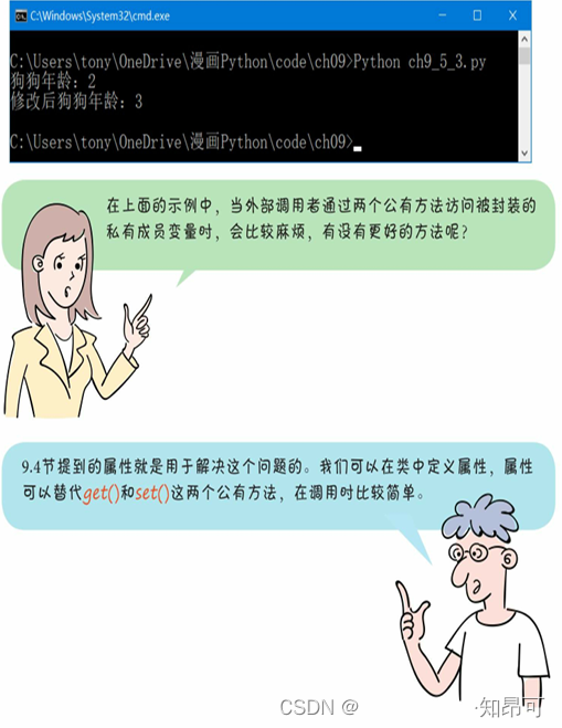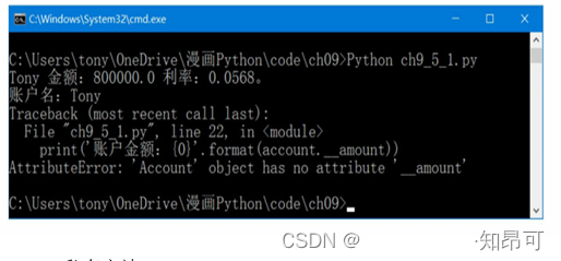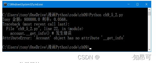由于在类的外部不可以访问私有变量,因此上述代码在运行时会发 生错误,通过Python指令运行文件,输出结果。
