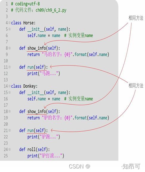 Python的多态性更加灵活,支持鸭子类型测试。鸭子类型测试指: 若看到一只鸟走起来像鸭子、游泳起来像鸭子、叫起来也像鸭子,那么 这只鸟可以被称为鸭子。