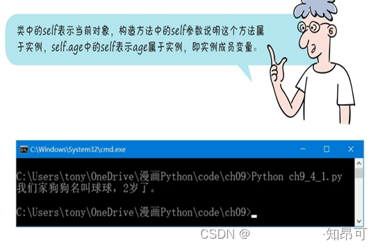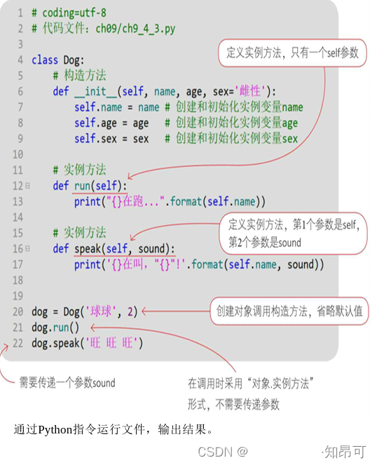 定义实例方法时,它的第1个参数也应该是self,这会将当前实例与 该方法绑定起来,这也说明该方法属于实例。在调用方法时不需要传入 self,类似于构造方法。
