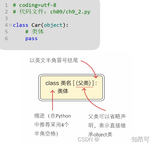 Python中的数据类型都是类,我们可以自定义类,即创建一种新的 数据类型。Python中类的定义语法格式如右图所示。 定义小汽车(Car)类的代码如下: