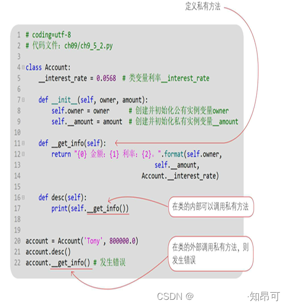 私有方法与私有变量的封装是类似的,在方法前加上双下画线(__ )就是私有方法了。示例代码如下: